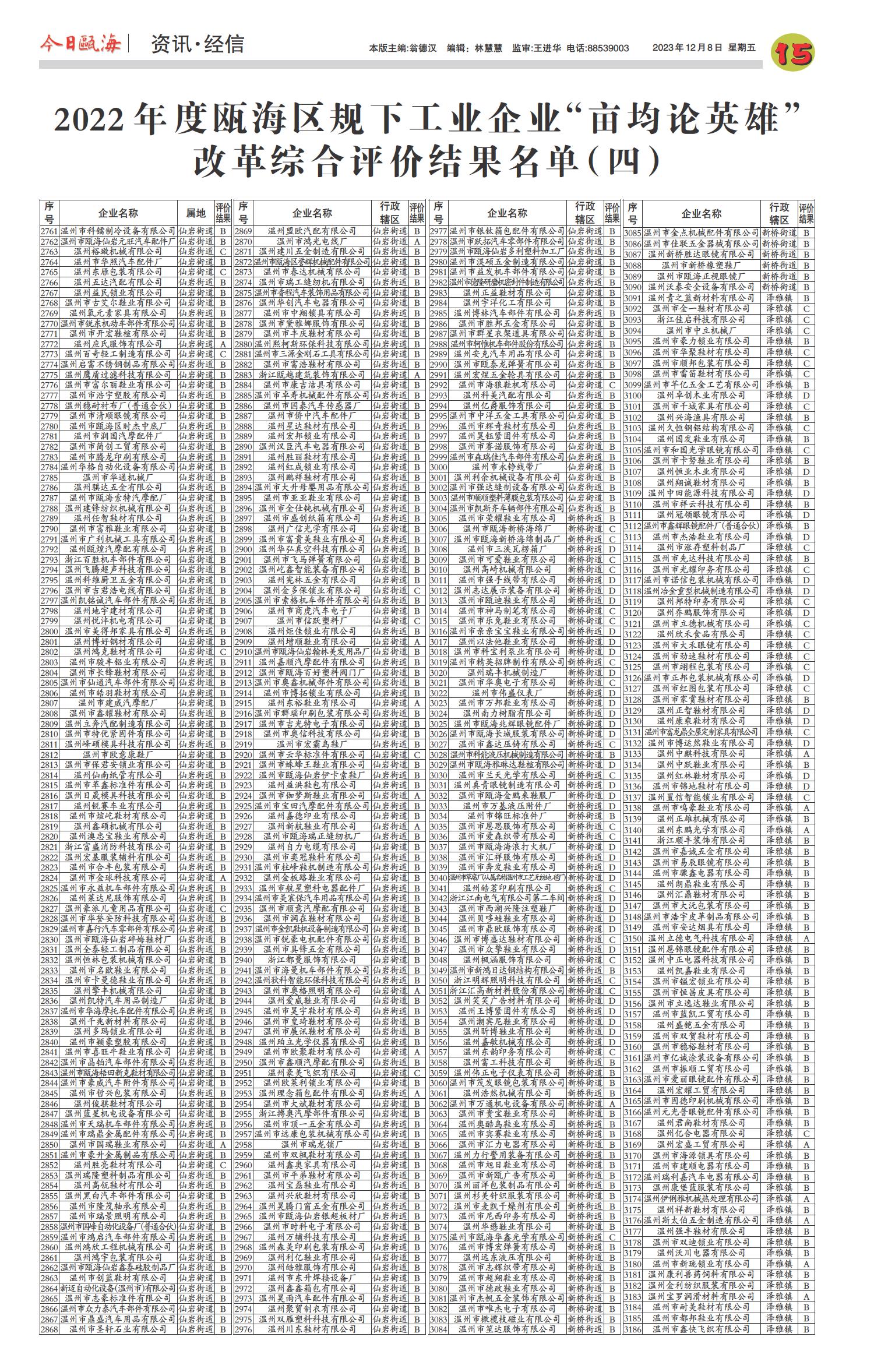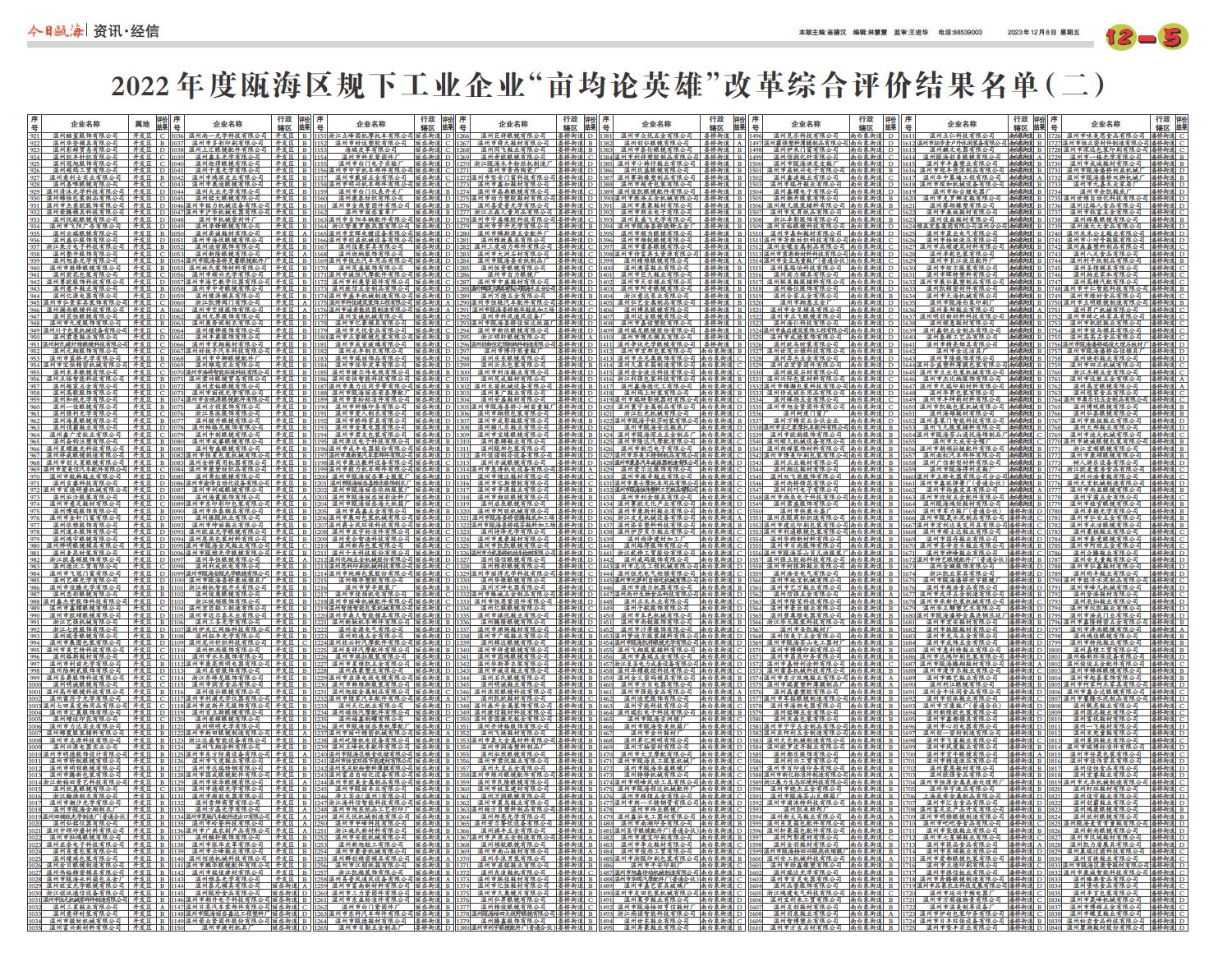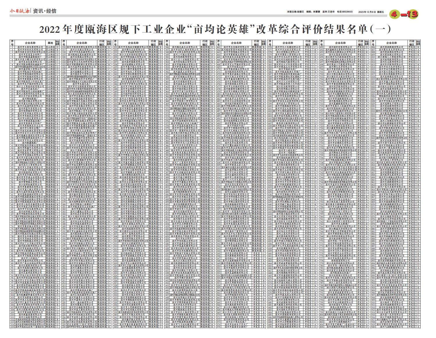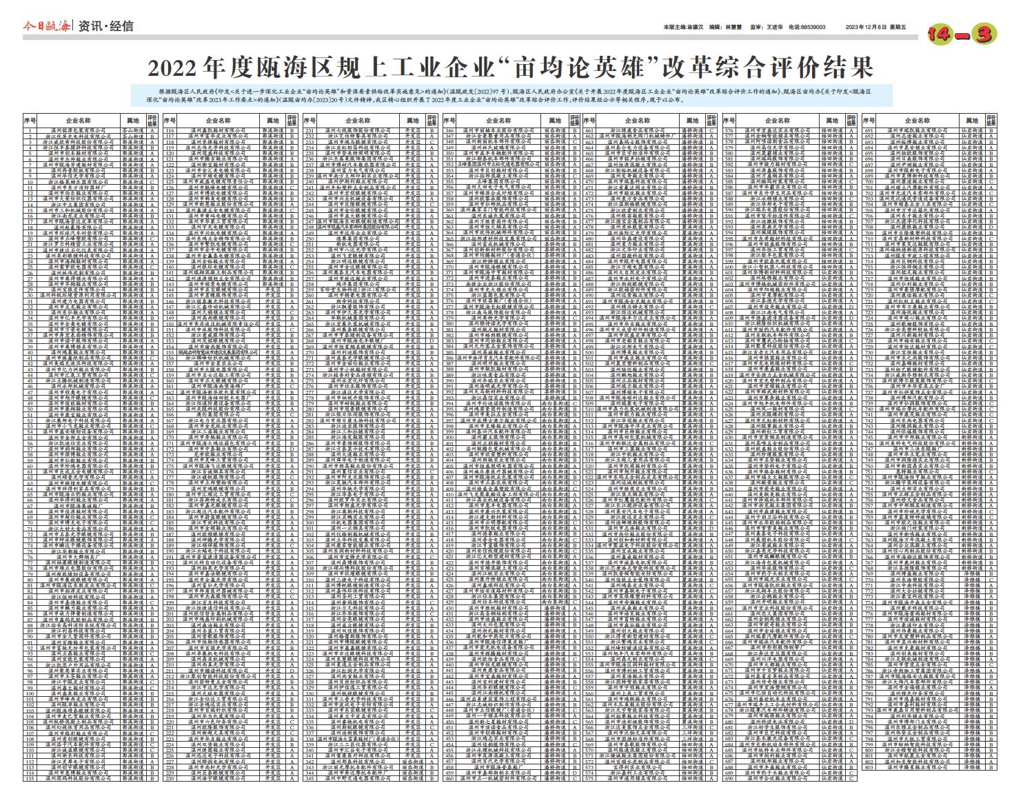 2022年度瓯海区规上工业企业“亩均论英雄”改革综合评价结果