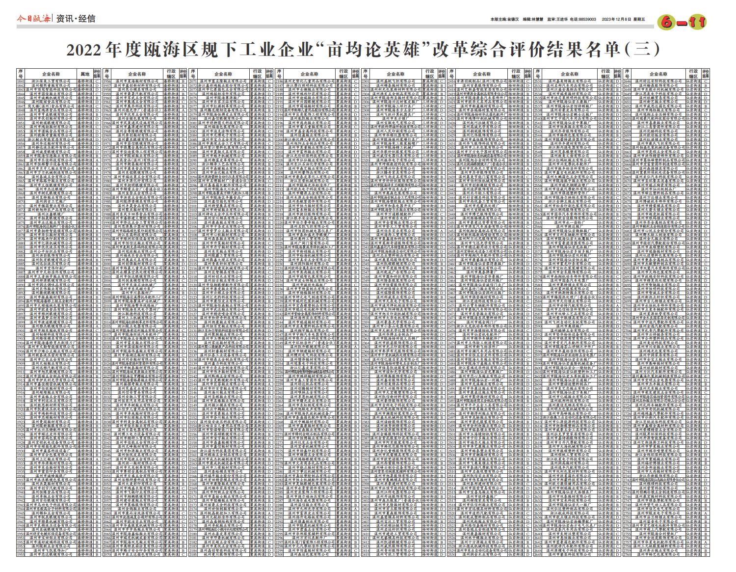 2022年度瓯海区规下工业企业“亩均论英雄”改革综合评价结果名单(三)