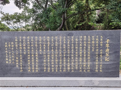在茶冠的一侧,立有一块《千年唐茶记》石碑。上载:“大罗山有一山茶逾一千二百年而不败矣名曰金心人谓唐茶今誉称世界茶花之王……”可见,此茶花的正式名称应该叫做“金心山茶”,是茶花中最古老的原始品种。其花期更与众不同,自农历十月份开始次第开放,至次年的农历三月,长达半年之久,每年农历的正月、二月为开花旺期,花满枝头。碑文除介绍茶花的生长环境与生长状况外,还叙述了从前被人肆意破坏的情况“然则世事无常癸亥之时忽遭毒手旁枝尽剔空留干头”,警示后人,爱护茶花。