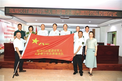 该志愿服务队立足“关爱青少年教育”,在燎原小学设立首个“关爱青少年教育基地”,并给区原声法治和平安建设艺术团增加授予“红星老兵艺术团”,精心设计制作以“八一”军旗为特征的志愿服务队队旗、臂章等。