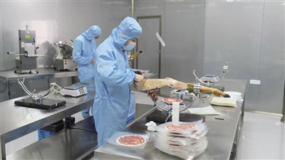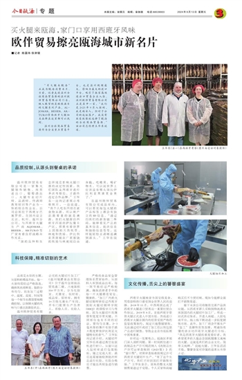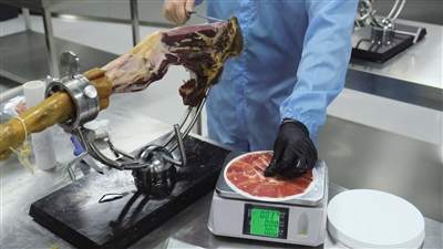严格的食品安全管理体系贯穿始终,从原料入库到成品出库,每一环节都经过严格检测,确保消费者手中的每一片火腿都是安全、健康的。“加工厂内的火腿切割师皆经过西班牙国际火腿切割师学院(EICJ)的课程学习与考核。因为火腿切片的薄厚和宽度非常关键,不同部位也有不同的切法,要均匀且薄,2-3毫米厚的薄片有助于最大程度释放伊比利亚火腿特有的香气。”王华东向记者介绍,火腿切片完毕后再通过真空包装机进行封口,从窗口送入包材库进行包装贴标,随之完成入库。最后还需要抽检该批次样品进行化验,化验合格后才能出具报告进行销售。